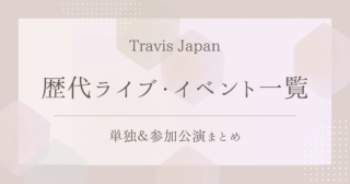 ライブ / 舞台Travis Japanの歴代ライブ・イベント一覧|単独&参加公演まとめ Travis Japanの歴代ライブ・イベント情報を日程付きで一覧化しました。単独公演から合同イベントまで、これまでの出演記録をまとめてチェックできます。 2026.02.22ライブ / 舞台
