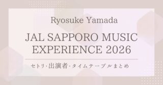イベント / フェス【JAL SAPPORO MUSIC EXPERIENCE 2026】Ryosuke Yamada|セトリ・出演者・タイムテーブルまとめ Ryosuke Yamadaが参加した「JAL SAPPORO MUSIC EXPERIENCE 2026」の情報をまとめています。出演アーティストやセットリスト、タイムテーブルもあわせて紹介。イベントの内容を知りたい方はぜひチェックしてください。 2026.04.19イベント / フェス