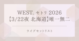 セットリストWEST. セトリ 2026【3/22夜 北海道】唯一無二|ライブセットリスト WEST.の2026年ライブ「唯一無二」北海道公演(3月22日/夜公演)のセットリストをまとめています。曲順やライブの雰囲気を知りたい方はぜひチェックしてください。 2026.03.22セットリスト