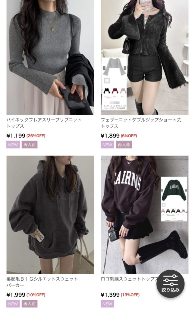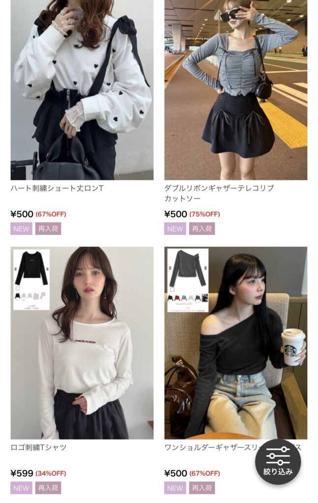 ワンピースやブラウス、セットアップなど、1,000円〜2,000円台のトレンド感あるアイテムが多数あります。